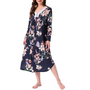 INSPIRE CHIC Women's Floral Pajama Midi Dresses V Neck Long Sleeve Lace Trim Midi Nightgowns - 1 of 4