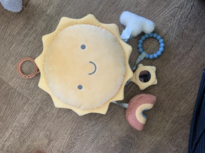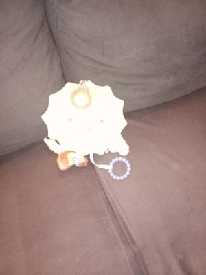 Wow..... This hang up or carry around toy is So Fun!! The kids are just having an absolute Blast with it. The Plush Sun Face is really cute and inviting to play with and then his little friends, the baby mirror sun, the rainbow and a cloud are along for all of the fun.