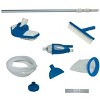 Included in the kit: Leaf rake with debris net, curved wall brush, deluxe vacuum head with 2 nozzles, scrubber vacuum, telescoping aluminum pole, and 24-foot hose with connectors