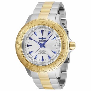 Invicta 2307 Men's watch features polished finish two tone gold plated stainless steel case with unidirectional rotating bezel and screw down crown. This great watch also comes with high quality Japanese automatic movement, scratch resistant mineral crystal, water resistant up to 200 Meters, polished finish two tone gold plated stainless steel bracelet with fold over clasp and silver dial with luminous hands and blue hour markers.