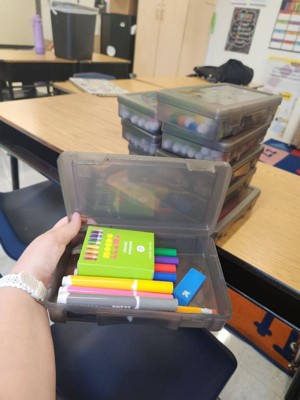 [This review was collected as part of a promotion.] These are perfect to provide pre packaged supplies to my students who can't afford their own. Now they will have an organized pencil box when they arrive to the first day of school. I took off a star because the back connecting part of the box can easily get confused with the front latch to open.