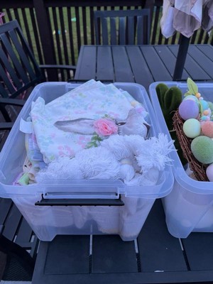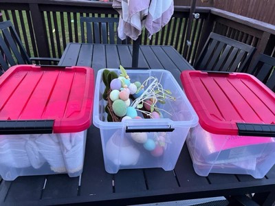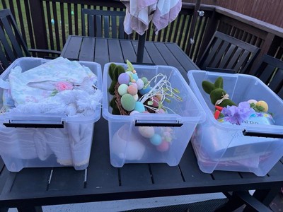 [This review was collected as part of a promotion.] durable storage bins. Great for storing away Holiday decor, I used them to put away Easter decorations. Easy to use and very simple top that locks.