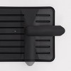 [This review was collected as part of a promotion.] Wow, this dish rack is such a more elegant solution than the basic plastic ones that are an eyesore and allow water to collect in flat tray. This drip tray features a moveable spigot that can be easily rotated 360° to drain the water exactly where needed. It’s also far better than the recently popularized drying mats, which allow water to stay on the counter. I like the stainless steel and black look. In the Karen handling though it states that wallet has a high rust and corrosion resistance it’s not completely rust proof and iron or salt can cause rusting. Water here has high mineral output, so that’s a little disappointing. A cup of water was poured into the rack for purpose of this photo to show fast draining movement.