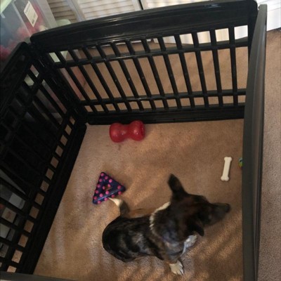 [This review was collected as part of a promotion.] Great pen for small pups. The door so you can just open it and let them out rather than having to lift them over is nice and would be even nicer in the taller versions. It is lightweight enough to move around but sturdy enough that the pups can’t knock it over easily.