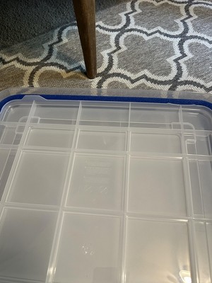 I have ordered these on numerous occassions with the blue lid, and I have only had minor issues with one lid. No complaints with those. I don't know if this clear plastic lid is a different quality plastic or what. 3 out of 4 lids had damaged interior tabs. These were on sale, so I ordered these instead of the blue. Also, the box was undamaged and it seems like it was a thinner box than before. One bin was missing a latch and it wasn't in the box! They wanted me to mail these back. Too much trouble!