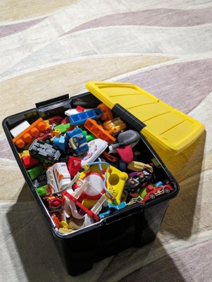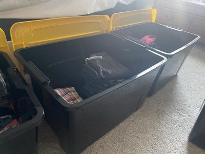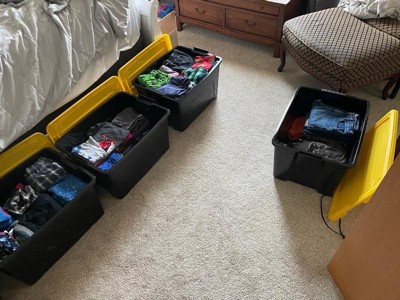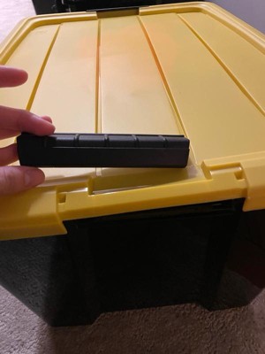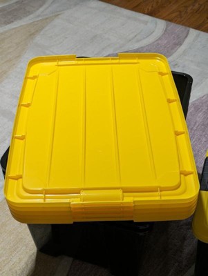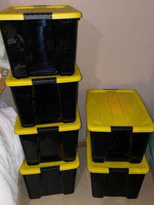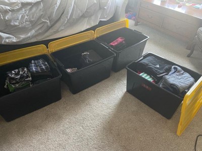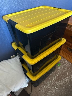 [This review was collected as part of a promotion.] These storage bins really came in handy recently when we did some organizing in our home. They are a good size and can hold quite a lot of things. They are sturdy and easy to carry. Best part is how they stack nicely on top of each other. I think they look pretty good too. It is nice they have a yellow cover, they are easy to see in a dark basement where we are keeping them.