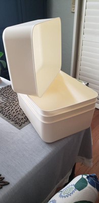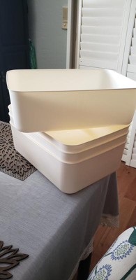 [This review was collected as part of a promotion.] These storage bins are great for use as a storage basket or cupboard organizer. They are a soft off-white color with rounded corners, cute and stylish. I use one in my bathroom to store shampoos and other hair products. I have one under my kitchen sink to store cleaning products,sponges,etc. I have the other two in my hallway cupboard to hold things like batteries, plastic utensils, vitamins, craft items, and more. They would work great in a dorm room where space is limited, even under the bed. They are cute enough to put on a shelf. I'm thinking about getting more to use in my pantry. They are sturdy enough!