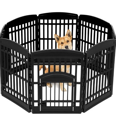 The easy-access IRIS 34'' Exercise 8-Panel Pet Playpens are perfect for medium to large sized dogs and other family pets. Use it as an indoor dog fence, play gate, dog play yards, or dog exercise pens. The durable molded indoor pet pen will last for years. Portable playpen can be positioned in different shapes to best suit your space capacity and pet's needs. The plastic panel on the dog playpen securely snaps together to keep your pet inside. The panels for dog exercise pen also feature a non-skid rubber foot to protect flooring.