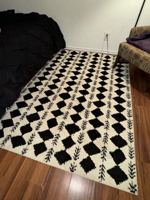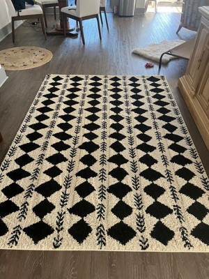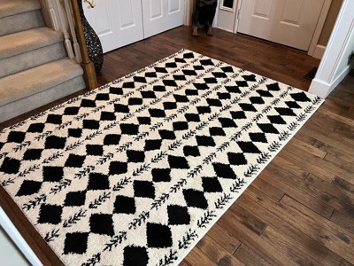 Refresh your living room floor with this Irregular Diamond Shag Area Rug from Threshold™. This rectangular shag area rug showcases a black irregular diamond pattern on an off-white base for modern flair. The tufted shag construction adds soft comfort to your flooring for a cozy feel underfoot, while