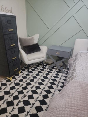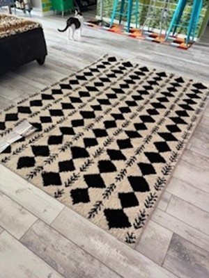This rug completes the entry way to my home perfectly. I always have a hard time finding rugs that fit my aesthetic and end up with something plain. I love the funky but simple pattern of this rug and that it is a simple black/white color. The rug is soft and plush. It is easy to vacuum. It came with a card that said it could be thrown in the dryer to get rid of wrinkles or “new rug smell” but we didn’t notice any wrinkles or smell at all.