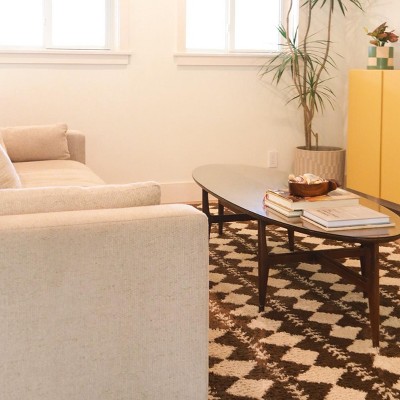 This Threshold 5” x 7” Irregular Diamond Shag Area Rug Brown features a modern pattern of irregular off white diamonds in a brown base for a rustic feel. It is a very neutral color and goes well with other color pallets in the house. The rug is constructed with tufted shag with low pile height for a very soft and comfortable feel. It is very durable made from fade and stain-resistant fabric. It has latex backing for safety to prevent slipping. STANDARD 100 by OEKO-TEX certified. A very stylish and well constructed rug for this price point.