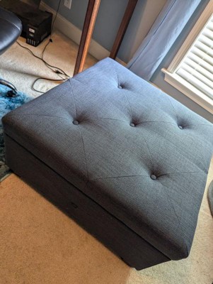 The Madison Park Isaac Ottoman offers a versatile storage option that's full of style for your home. This square storage ottoman is upholstered in a charcoal color fabric and features button-tufted details on the top and sides that add an elegant touch. Solid wood legs with a black finish complement the upholstery. Providing ample storage space for your blankets and other essentials, this upholstered ottoman makes a great addition to any room in your home. Assembly required.
