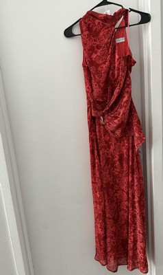 • A: The dress features an asymmetrical design with a chic high mock neckline.