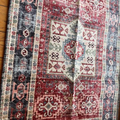 [This review was collected as part of a promotion.] The rug is okay in design. I expected a little more of a faded, antique-like coloring but is quite bright. I initially was going to put in front of my kitchen sink, but it’s quite thin, and therefore not soft or comfortable to stand on for periods of time. I did put it in the entry way from dining room to kitchen and it fits great and doesn’t move around a lot.