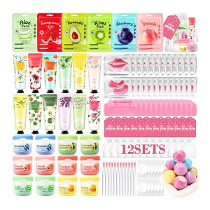 - This spa party supplies kit includes 12 pieces each of hydrating facial masks, under eye patches, hand lotion, lip balm, lip mask, foot bath bombs, compressed towels, organza gift bags, silk headbands, and skincare cards. With 132 items in total, it can support multiple people to do skincare together at a spa party.