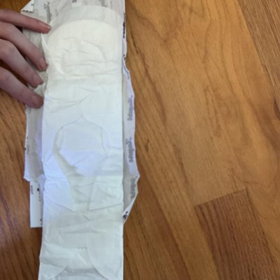 These are really soft and comfortable. They say the adhesive lasts a long time, but for me, the wings barely stick and the pad itself bunches in the back. Although it holds blood well, it leaks for me because I’m a definite side sleeper. The wrapper easily dissolves in hot water but it also rips really easily so be gentle