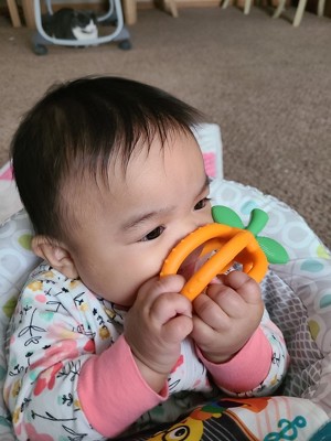 This was one of the first toys my baby could hold and bring to her mouth! She loves the textures on it especially the stem and leaves! She chews on this toy often! One of our favorites!