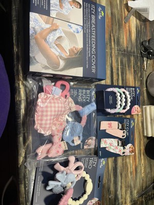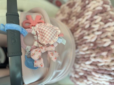 [This review was collected as part of a promotion.] This teething activity toy is perfect for on the go, whether you attach it to your stroller or car seat. The multiple textures of each piece keep baby entertained, especially the crinkle one. The colors and patterns are super cute. We use this toy every time we leave the house!