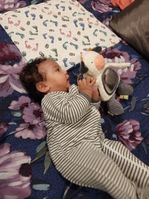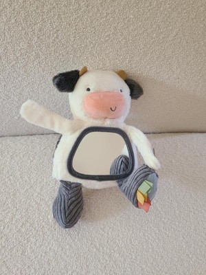 I love this Itsy Ritzy cow mirror toy for my baby! It's the perfect size and my baby enjoys looking at the mirror, crinkle sounds, and tags. The fabric is very soft and durable. We use it for tummy time, in the car seat, and on the play gym. It's great for helping with sensory development and motor skills. While it might be a bit small for some tummy time setups, it's still a fantastic toy overall. Highly recommend!