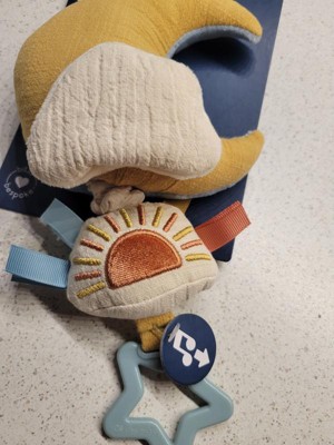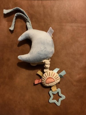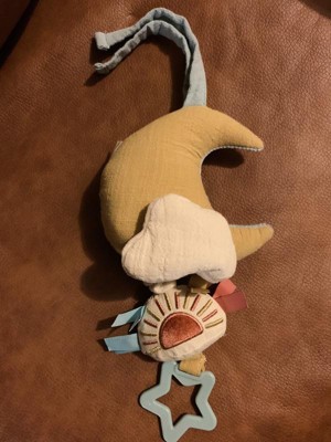 Plays 1 lullaby, which sounds like two songs mashed together. It’s not terribly obnoxious & the baby likes it. Too hard for a baby to pull themselves, which is typical of this kind of product/toy. The sun is a rattle and crinkles. The moon is linen on the front and velvety soft on the back. It ties, which makes it easy to put just about anywhere. I’d recommend this item or buy it as a gift.