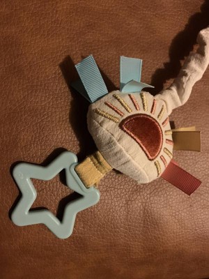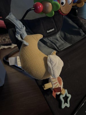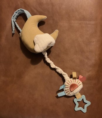 This Itzy Ritzy musical learning toy is so adorable. It easily attaches to a stroller, car seat or play seat and with a quick pull it play a very soothing lullaby. It is soft and has a ring on the end for baby to grasp. I do wish it attached with velcro but otherwise it is just so cute!