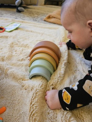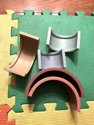 First off I will say these are much smaller and more flexible than what I thought they were going to be. My kids really like the flexibility of them though. The material is a smooth silicone type feel which is easy to clean. These really do appeal to a wide range of kids and can definitely grow with them! I've had kids ages 10 months through 11 years already playing with these rainbow stackers and the only complaint is that they could be slightly larger as some of the older kids want to drive their cars through them like tunnels. I would for sure consider adding this to any gift basket!