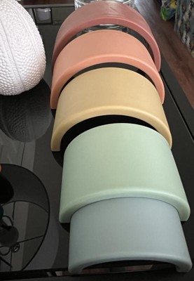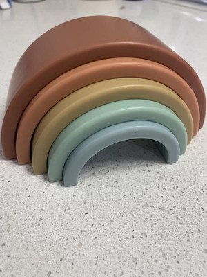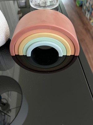 Super simple and sweet baby stacker. The colors are muted and pleasing but still fun. The plastic is soft and matte with no sharp edges. Rings stack easily and slide out to reveal the rainbow. My 5 month old nephew enjoyed playing with the pieces, putting them in his mouth and sliding them around. The pieces are wide enough so that baby can't choke or gag on them. A fun and engaging toy to have!
