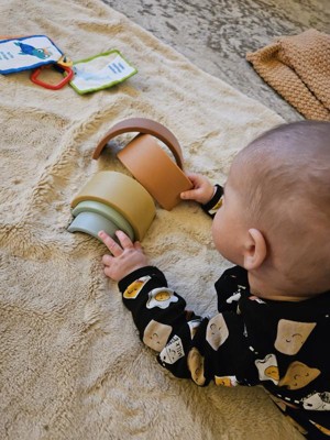 My baby girl loves this stacker. It’s very pretty and colorful. The texture is soft and has slight give and she loves chewy on it too. It’s a nice, simple, quiet toy she s how’s playing with. It also looks nice stacked up in her room.