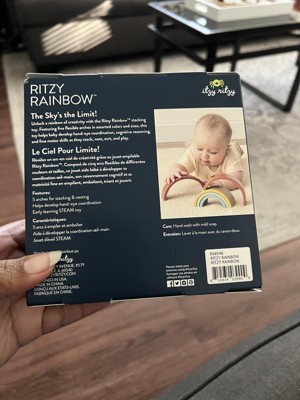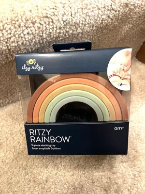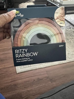 This ritzy rainbow stacking toy is a set of five arches. Each a different color and size. They are the perfect size for the little ones to hold and stack, They are flexible it’s like a hard soft plastic. They are perfect for your little one this will help them with hand and eye coordination. They are easy to clean after each use. Just use soap and water. This toy is suitable for 0 months +