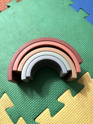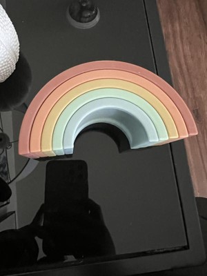 The rainbow stacking toy is so cute!! I have this on a shelf right now in the kids room, but it has also been an entertaining toy for my toddler! He loves to pretend that it's a little bed for his toys when he flips the pieces upside down! I could also see him using it as a ramp for his hot wheels! Parts are somewhat flexible and soft to the touch so my newborn will love playing with it when she is teething! And the colors are so modern!!