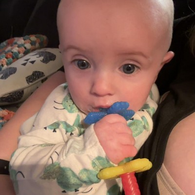 Baby loves this teether and all the different textures. It is easy to hold and maneuver so she can chew on the various parts.