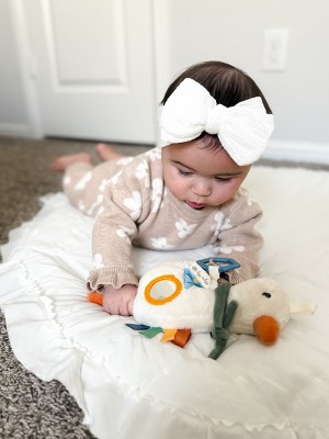 My daughter’s (4m) favorite toy. She can play, chew, and cuddle it. Plus it’s adorable! Wish you could clean it some way other than spot clean, but no other complaints.