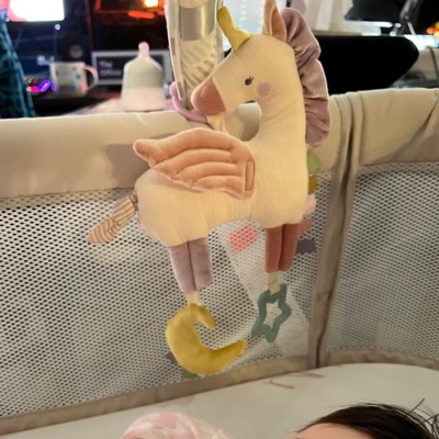 I bought this when my daughter was 2 months and hung it over her bassinet. She’s 4 months now and still LOVES this Pegasus. The quality is great and the different textures are great for a baby discovering how different surfaces feel. She loves to grab the moon and star that hang off the horse. Very well worth the $$.