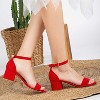 • With an open toe front and a secure ankle strap, these red suede heels effortlessly blend sophistication with a touch of romance. The 2.1 inches (approximately 5 cm) wedding block heels elevate your stature, granting you an air of regal poise as you make your grand entrance. • Designed for the modern bride who knows the importance of dancing the night away, these red suede low heels boast a sturdy block heel construction. • Handcrafted with care and passion from premium red suede vegan leather, you can embrace your wedding day in comfort and style. These red wedding sandals are here to witness and support every step of your journey.