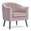 This charming accent chair features curved lines that will add a soft and elegant touch to your living room, bedroom, or office space. The deep seat of this bucket chair invites you to sit back and relax as the curved back and high arms wrap you in comfort. Flared arms and button tufting add a stylistic flourish that's sure to impress. Plush upholstery covers the tufted back for a luxurious look that is easy to maintain. Black tapered legs add a modern silhouette to this timeless armchair.