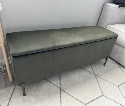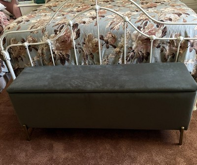 I saw this in the store and fell in love immediately! Went home and ordered it online which was on sale thru Target Circle. Came quickly and packaged securely. The sage color is very neutral and the width is narrow enough not to make it bulky. Legs were separate in box but attached easily. Nice hinged top with generous storage. Looks great at the foot of my queen bed. Practical, good looking and reasonably priced! Buy it before it’s gone!