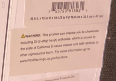 Checked online for Proposition 65 warning prior to making the trip to our local Target store to purchase this item. In store, the deep olive colored velvet-upholstered bench on display did not have a Prop 65 warning anywhere plainly visible--as specified by California State Law. The one my family chose to buy was stored off the sales floor, sealed in a cardboard box. Wasn't until my family members unboxed it that I could smell an overwhelming chemical odor that caused me to be nauseous and dizzy. Left it empty and ajar to air it out for weeks. The strong chemical odor did not fade. Anytime I walked or sat near it, I became dizzy and nauseous. Wasn't until I moved the bench and saw the underside of it that I saw the Prop 65 warning See attached pictures. No wonder the strong chemical odor caused such dizziness and nausea! Brought it back to the store to return. Absolutely do not recommend. Also note: the velvet, although attractive, scratches and balds easily. Ours came with permanent scratches on the seat of the bench and balding on the corners. See attached pictures. We never used ours- only left it empty and slightly opened to air out.
