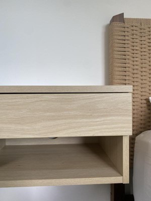 If you’re looking for a minimalist, space‑saving nightstand with a mid‑century vibe and neat cable‑management built in, this is a great choice! The only downside for me is that the color doesn't match our bed, which is also light oak, but I plan on painting the nightstand a fun color!
