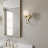 Elegant curves and soft, glowing beauty define the Jacobs Collection-a delicate balance of form and feeling. Finished in a warm bronze gold, its gracefully arched arms and petal-like cups cradle tulip-shaped etched alabaster glass shades, casting a light that feels tender and timeless. Available in multiple vanity sizes and as a single-light sconce, Jacobs is designed to bloom beautifully in any space-from cozy powder rooms to grand master baths. With every switch, it invites you into a moment of quiet luxury and refined romance.