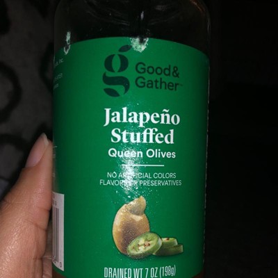 Wake up your taste buds with the zesty authentic flavor of Jalapeno Stuffed Queen Olives from Good & Gather™. These olives are hand picked at the peak of flavor before being slow cured, hand-stuffed with jalapeno and preserved in a delicate brine. The crisp, fresh, buttery flavor of the olives combined with the bite of zesty jalapeno makes a great snack right out of the jar, or provides an exciting flavor boost when used as a cocktail garnish or chopped and sprinkled on nachos, tacos or pizza.