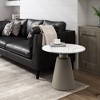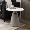 Add a touch of glamour to your home or office design with the Leda Side Table. Featuring a stylish faux white marble table top and black fluted base, the table lends a dramatic element to the space. Designed for today’s modern lifestyle, the table is made for both indoors and outdoors, and is the ideal piece to accompany a sofa, arm chair, bed, or patio furniture. The compact footprint is perfect for small spaces. Lightweight, weatherproof, and made of a durable molded clay fiber. Easy to clean surfaces. No assembly required. Measures 17.7”W x 17.7”D x 18.9”H. Base diameter is 12”W.
