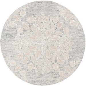 Transform your space with this stunning round area rug, measuring 6 feet by 6 feet. Its elegant grey and ivory tones embrace the beauty of transitional style, making it a versatile choice for any decor. Crafted with an exquisite floral pattern, it adds a touch of nature's charm to your home. The hand-tufted weave technique highlights the expertise and care poured into each piece. Made with a blend of wool and polyester, the rug offers a welcoming texture underfoot. With a height of 3/8 inches, it balances comfort with convenience. Originating from India, this rug brings an artistic flair to your living area, effortlessly enhancing its allure.