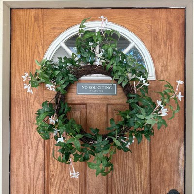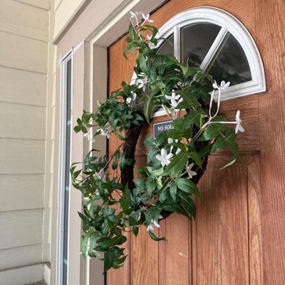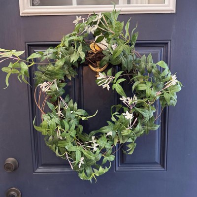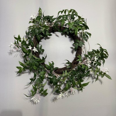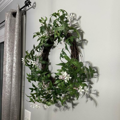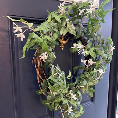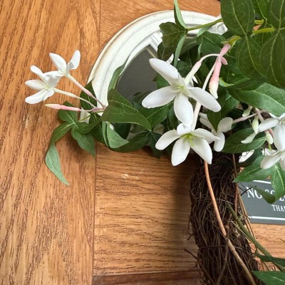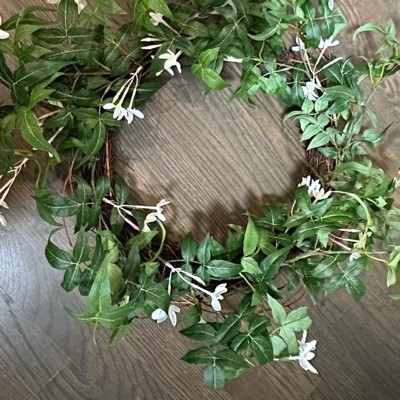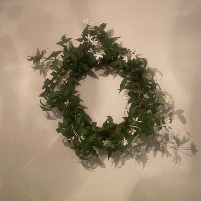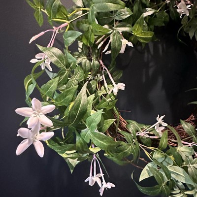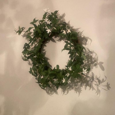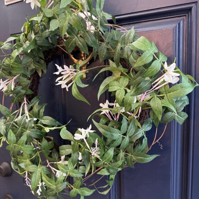 [This review was collected as part of a promotion.] This is a really chic and charming Jasmine wreath from Threshold. The wreath is really full and covers the entire wreath with leaves and jasmine flowers. The size is great with the wreath being seven inches high and twenty two inches wide. If you’re wanting to add color you could easily add some additional faux flowers.
