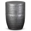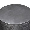 The Jean Tribal Pattern Metal Accent Table in Antique Silver exudes vintage elegance and modern durability. Its powder-coated metal construction features a striking antique silver finish with a hand-applied patina effect, creating a perfect blend of timeless design and contemporary practicality. Lightweight yet sturdy, this drum-style side table enhances transitional, industrial, or bohemian interiors. Ideal for use as a decorative accent, plant stand, or side table, it offers functional versatility in living rooms, bedrooms, or commercial settings.