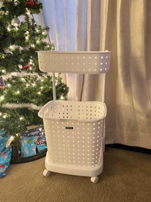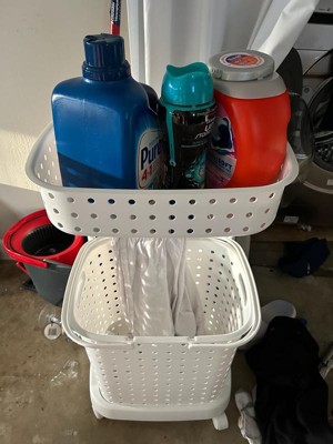 [This review was collected as part of a promotion.] I love this! I use this in front of my washer and dryer and keeps all my laundry products on top. I use the bottom part for dirty clothes, although it does not hold a whole lot of clothes. Easy to put together and does come in handy! Oh, and love that it rolls.