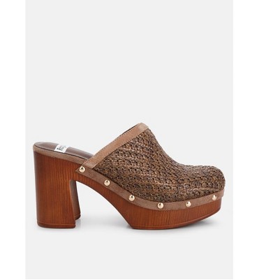 Sophisticated elegance and intricate craftsmanship! The raffia clogs are a classy yet rugged pair of shoes with woven detail on the vamp. The metallic studs add a touch of elegance to the design while the light cushion insoles cut strain and offer comfort to the feet. Type: Clogs Upper Material: Raffia Light Cushion Insoles Outer Sole: Pleather High Platform Block Heel Closed Round Toe Woven Vamp Textured Heel Stud Embellishments Slip On Style RCSH4740