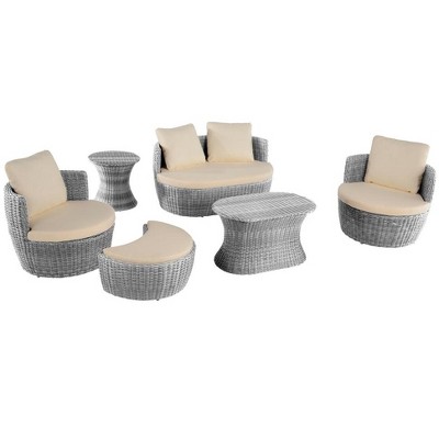 - Set includes: One loveseat, two armchairs with seat cushions and back pillows and one coffee table and end table