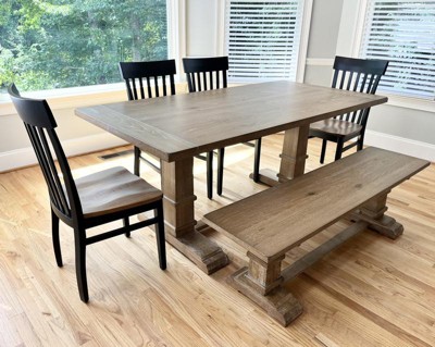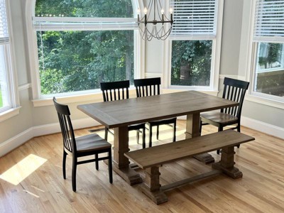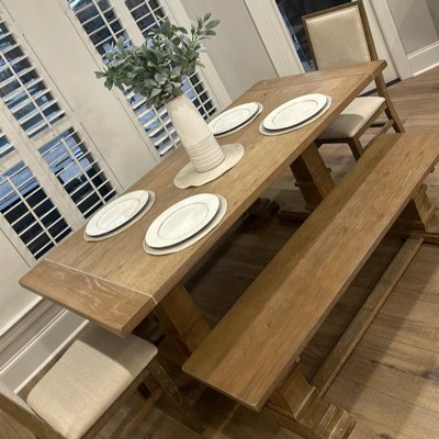 Achieve the look of laid-back elegance with the Joanna Dining Table. Combining a beautifully rustic finish with a classic farmhouse design, this trestle table will be your go-to for large family gatherings. The substantial rectangle tabletop is enhanced by large pedestal columns with decorative trim on the trestle base. Ready to be the focal point of your dining room, the Joanna Dining Table can pair with a variety of dining chairs and seats up to 8 diners.