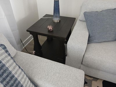 I love this end table and the matching coffee table. The color is a brownish grey and it matches my furniture well. I love that I’m able to store items on the shelf below.