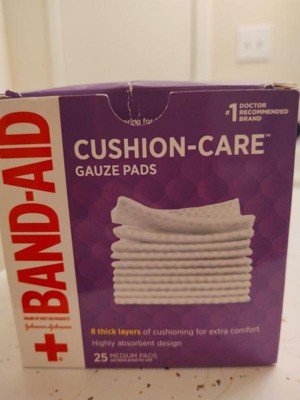 A covered wound heals faster than an uncovered one. Band-Aid Brand Cushion-Care Gauze Pads are designed to protect minor cuts, scrapes and burns. Made with unique Quilt-Aid Technology, these individually-wrapped sterile gauze pads feature deep pockets to wick away fluid from wounds to help keep them clean. Cushion-Care Gauze Pads have 8 thick layers of soft cushioning for extra comfort. These medium square sterile pads are 3 inches x 3 inches in size and can be used with Band-Aid Brand of First Aid Products Flexible Rolled Gauze to firmly secure the non-stick gauze pad in place. From the #1 doctor-recommended brand, these non-adhesive gauze pads are essential first aid supplies and not made with natural rubber latex.